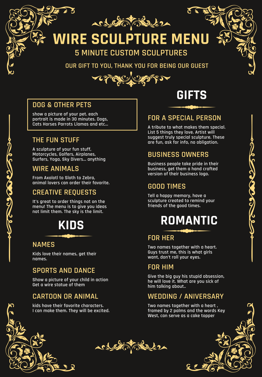 Ryan chats with your guests, learns about their favorite things and bends wire into a personalized sculpture in 5 minutes right before their eyes. They can make silly requests, or ask for personalized memories, One person may want a portrait of their dog, another person might request a scuba diving Parrot, or the latest cartoon character, or a sunflower with a name, maybe a copy of of their kid playing sports. With 30 years of wire crafting experience no request is too difficult. you can be assured that your guests will be excited with the result.